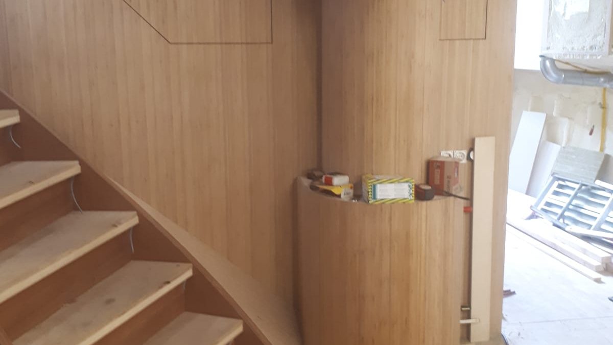 Zo goed als alle elektriciteitsdraden liggen op hun plek, het meeste installatiewerk is gedaan en de bamboevloer ligt er in. Alle apparatuur wordt nu aangesloten zodat het interieur kan worden geplaatst.